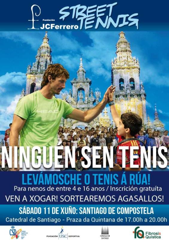 A iniciativa ‘Street tenis, ninguén sen tenis’, promovida polas fundacións Juan Carlos Ferrero e Deporte Joven-CSD coa colaboración da Fundación USC Deportiva, chegará a Santiago, por primeira vez en Galicia, este sábado 11. Trátase dunha actividade gratuíta dirixida a nenos e nenas de entre 4 e 16 anos que terá lugar ao aire libre na Praza da Quintana de 17.00 a 20.00 horas.