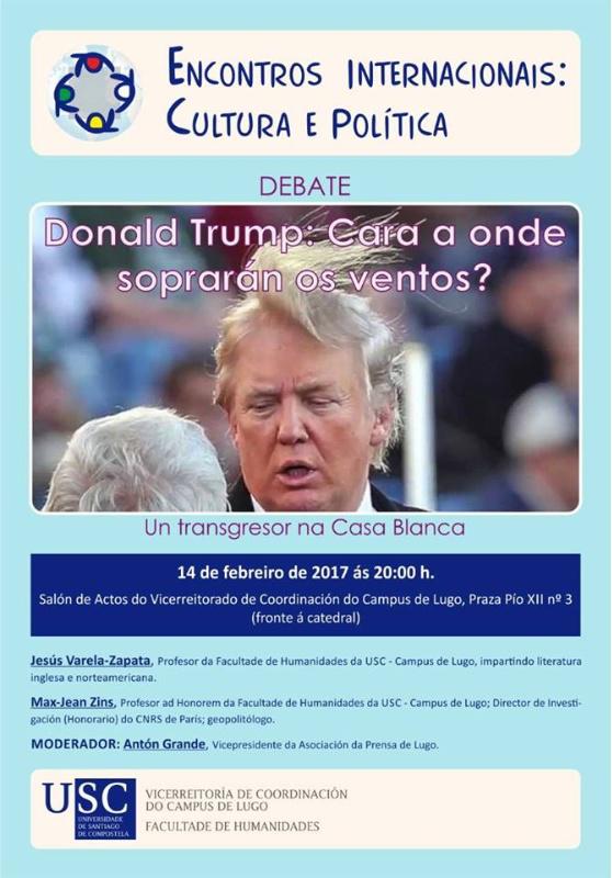 A chegada de Donald Trump á Casa Branca centrará este martes, a partir das 20.00 horas, no auditorio da Casa do Saber de Lugo, a temática do coloquio ‘Donald Trump: Cara a onde soprarán os ventos’’, un foro organizado no marco dos ‘Encontros Internacionais: Cultura e Política’, no que intervirán como relatores o profesor ad honorem da Facultade de Humanidades da USC Max-Jean Zins e o tamén docente no centro universitario lugués Jesús Varela Zapata.