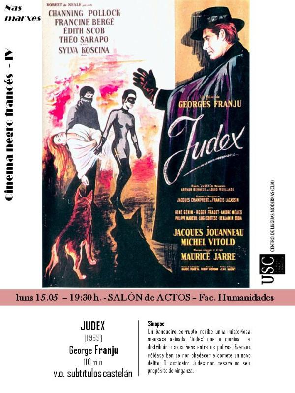 A terceira das proxeccións programadas na cuarta edición do ciclo de cinema negro francés, responde a un filme de intriga cuxo fío condutor xira arredor dun xusticeiro que esixe ás persoas que reciben unha mensaxe coa palabra ‘Judex’ o reparto de todos os seus bens e propiedades .