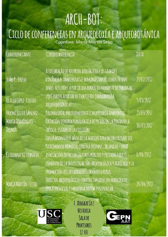 O Grupo de Estudos para a Prehistoria do Noroeste Ibérico-Arqueoloxía, Antigüidade e Territorio da USC (GEPN-AAT) continúa ata o mes de abril co seu ciclo de conferencias Arch-Bot en arqueoloxía e arqueobotánica que coordina María Martín Seijo e no que participan especialistas internacionais de recoñecido prestixio. Todas as intervencións serán na Sala de Profesorado da Facultade de Xeografía e Historia ás 17.00 horas.
