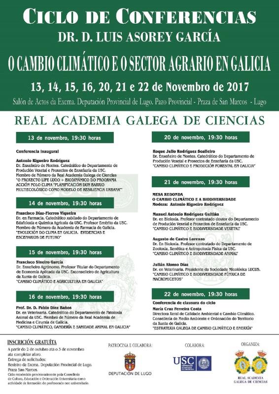 O cambio climático e a súa posible incidencia no sector agrario en Galicia centra a temática sobre a que versarán os distintos relatorios do ciclo Luis Asorey García, un programa formativo e de divulgación organizado pola Real Academia Galega de Ciencias en colaboración coa USC e a Deputación Provincial de Lugo que se desenvolverá no lugués Pazo de San Marcos do 13 ao 22 de novembro.