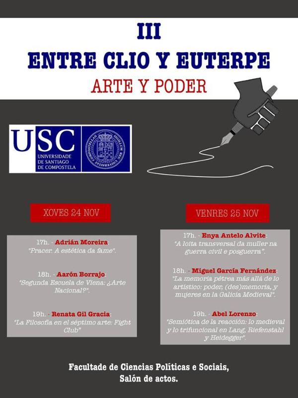 Baixo o título Entre Clío y Euterpe: Arte y Poder, novos investigadores en ciencias sociais organizan un ciclo de conferencias que nesta ocasión, en Ciencias Políticas este xoves 25 e venres 25, procurará relacionar o máis aparentemente inocente coas estructuras de poder.