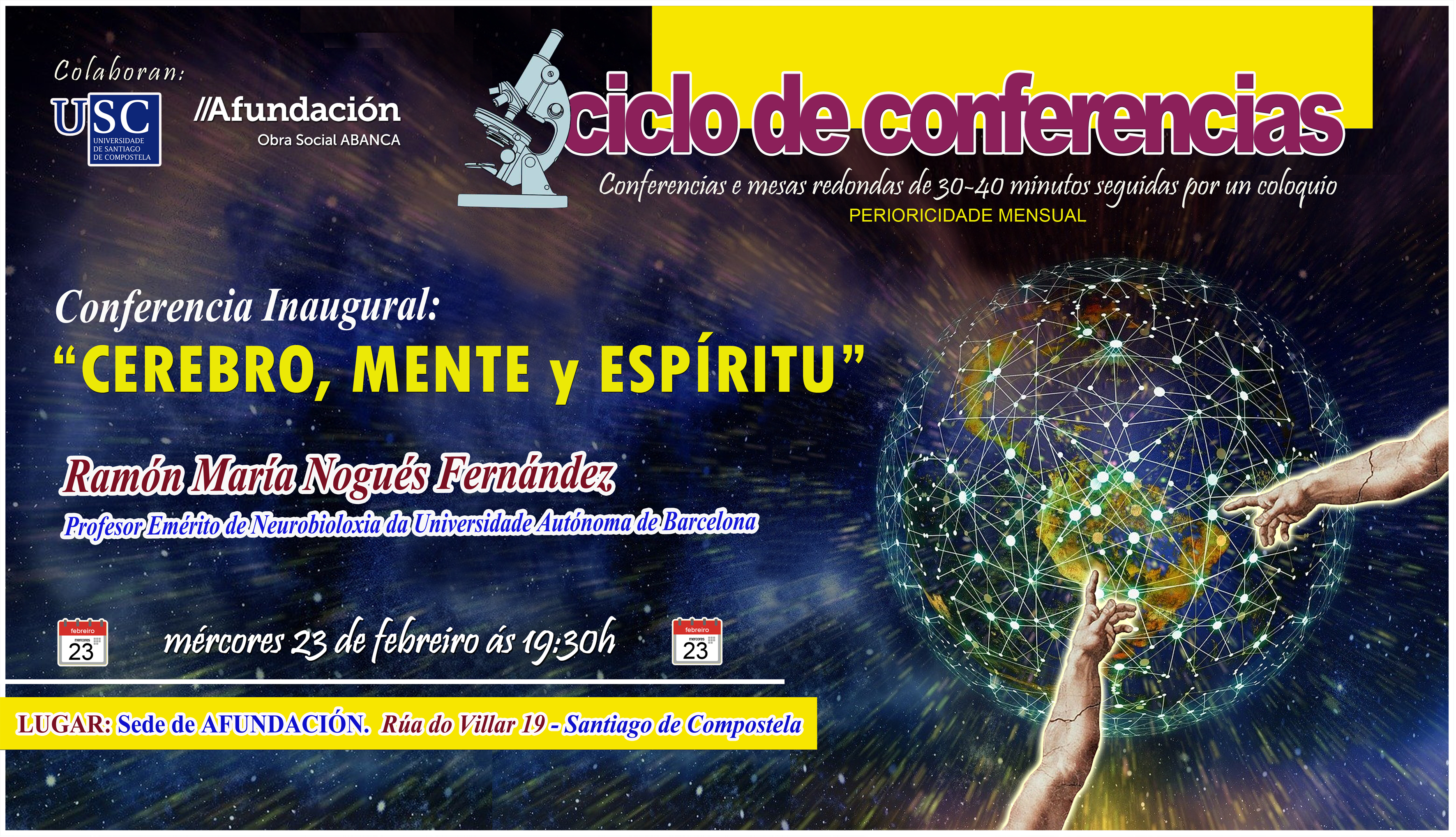 O relatorio celebrarase o vindeiro mércores 23 de febreiro na sede Afundación de Santiago de Compostela (Rúa do Vilar, 19), a partir das 19.30 horas. A conferencia leva por título ‘Cerebro, mente e espírito’ e agárdase que sexa a primeira dunha serie de relatorios que se desenvolverán cunha periodicidade mensual.