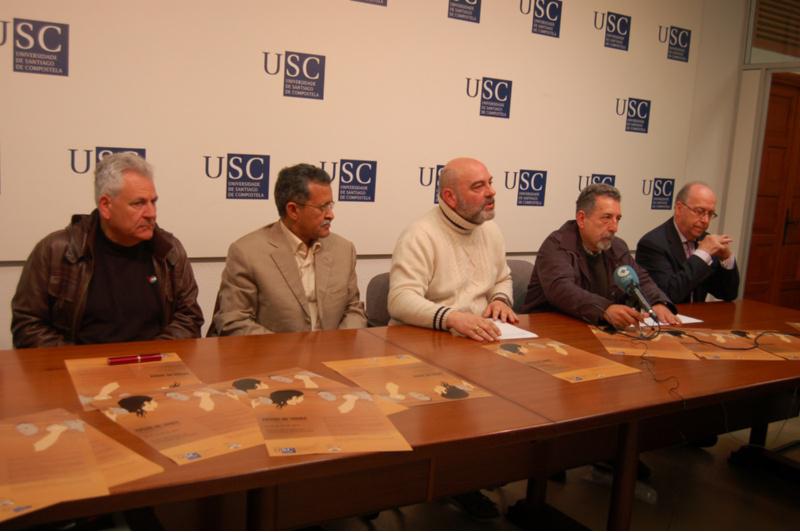 Un pobo rachando as arañeiras do esquecemento. Así se presenta o ciclo de cinema documental que durante o mes de abril mostrará na USC a realidade dos saharauís, cunha historia marcada pola loita de descolonización que iniciou contra España e hoxe a enfronta politicamente a Marrocos. Axudado pola participación de destacados especialistas e coñecedores do conflito, o público que se achegue os luns e mércores entre o 8 e o 24 de abril ás 19.30 horas á Facultade de Filosofía terá a oportunidade de asistir a un mundo máis tráxico que exótico no que se atoparán vidas intensas, delicadas percepcións e un constante canto á coraxe e á vontade de subsistir. Un achegamento ao horizonte cultural do Magreb desértico que busca provocar nos espectadores inquedanzas, interrogantes e curiosidade por unha concepción máis global e diversa do mundo. ‘Espellos dende o Sahara. Un pobo rachando as arañeiras do esquecemento’ presentárono este martes no Colexio de Fonseca o director da Área de Cultura, Pablo Sampedro; o delegado saharauí en Galicia, Habibulah Mohamed Kori; o profesor de Historia Medieval da USC e vicepresidente da Coordinadora Estatal de Asociacións Solidarias co Sahara (CEAS-Sahara), Santiago Jiménez Gómez; o catedrático de Historia do Cinema, Luis Hueso; e o vicepresidente de Solidariedade Galega co Pobo Saharauí, Enrique Porto. Habibulah Mohamed Kori mostrouse moi satisfeito pola organización deste ciclo “nun momento crucial no que o pobo saharauí vive practicamente nun estado de queda axudado en certa maneira pola ausencia de repercusión mediática”. Este ciclo servirá para denunciar “o silencio no que vivimos”, dixo, “un silencio que sempre é o mellor aliado dos sistemas que violan o dereito internacional”. Kori participará, xunto ao escritor Manuel Rivas, na xornada inaugural do ciclo, o 8 de abril, na que se proxectarán os traballos ‘Sáhara. Llamando a las puertas del cielo’, unha cinta de 66 minutos de Pedro Pérez Rosado, e ‘Un grito desde el Sáhara’ (48 minutos), unha produción de Unai Aranzadi coa ONG Mundubat que investiga as dramáticas consecuencias que este conflito ten para os civís saharauís, destacando o papel da muller. Seguintes sesións O 10 de abril será a quenda do filme ‘El rumor de la arena’ (82 minutos), de Jesús Prieto e Daniel Iriarte, que narra o reencontro dunha familia saharauí que leva máis de 30 anos sen verse. No coloquio participarán o profesores da USC de Historia do Cine José María Folgar de la Calle e o catedrático de Dereito Constitucional e experto na cuestión saharauí, Carlos Ruiz Miguel. ‘Gdeim Izik. Detonante de la primavera árabe’ (45 minutos) e ‘Tebraa. Retratos de mujeres’ (66 minutos) serán as proxeccións do 15 de abril, con comentarios da catedrática de Comunicación Audiovisual e Publicidade Margarita Ledo e da presidenta da Solidariedade Galega co Pobo Saharaui, Maite Isla Avión. Pedro Pérez-Rosado é o director da cinta de ficción guionizada ‘Wilaya’ (2012, 84 minutos), que presentará o 17 de abril o catedrático Luis Hueso Montón e o escritor e responsable da área de Cultura na Delegación Saharauí en España, Mohamed Ali Ali Salem. O 22 de abril é a quenda do documental ‘Hijos de la nube. La última colonia’ (80 minutos), dirixida por Álvaro Longoria e Javier Bardem en 2012. Será comentada polo profesor Xosé Ramón Pousa e polo presidente da CEAS-Sahara, José Taboada Valdés. O ciclo remata o 24 de abril coa proxección de ‘El problema. Testimonio del pueblo saharaui’ (80 minutos), coa intervención do codirector da película Pablo Vidal e do profesor Santiago Jiménez Gómez.