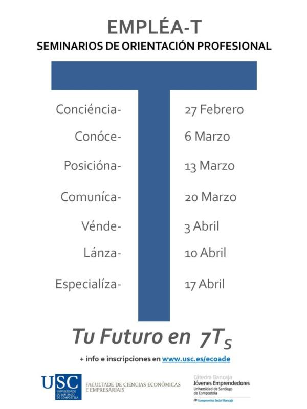 A Facultade de Ciencias Económicas e Empresariais vai desenvolver entre febreiro e abril o ciclo ‘Empléa-T’, unha serie de seminarios gratuítos para o estudantado que veñen cubrir unha competencias transversais de gran demanda polos empregadores. É unha iniciativa na que tamén participa a Cátedra Bancaja de Emprendedores Novos que cubre o 100% do custe dos seminarios. O obxectivo da iniciativa é atender o baleiro da formación regrada neste ámbito e completar o currículo formativo dos futuros profesionais, preparándoos para afrontar en mellores condicións a súa entrada no mundo profesional. Os principais destinatarios son o alumnado de Economía e Administración e Dirección de Empresas, con prioridade para quen curse o último ano da titulación e para matriculadas/os en Traballo Fin de Grao. O calendario comezará con Conciéncia-T, para abordar a situación actual do mercado laboral e as perspectivas de futuro, e continuará con Conóce-T, unha proposta que analizará os perfís profesionais para elixir ao candidato de cada posto e onde os participantes recibirán o seu perfil competencial; Posicióna-T, cunha reflexión sobre como destacar do resto de candidaturas nun proceso de selección; Comuníca-T, a modo de taller de comunicación e presentacións en público; Vénde-T, para traballar a actitude desexable nunha entrevista de traballo; Lánza-T, prestará atención a cuestións como o poder da iniciativa, o medo ao fracaso ou os talentos persoais; Especialíza-T, mesa redonda dedicada ao papel actual dos estudos de posgrao e o seu impacto no mercado laboral.