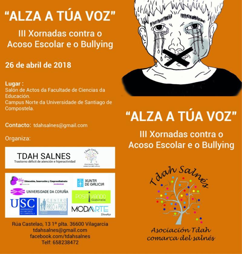 A Facultade de Ciencias da Educación (Campus Norte) acollerá o vindeiro xoves 26 as terceiras xornadas contra o acoso escolar e o bullying que nesta edición levan por lema ‘ Alza a túa voz’. Celebraranse no Salón de Actos a partir das 16.30 horas.