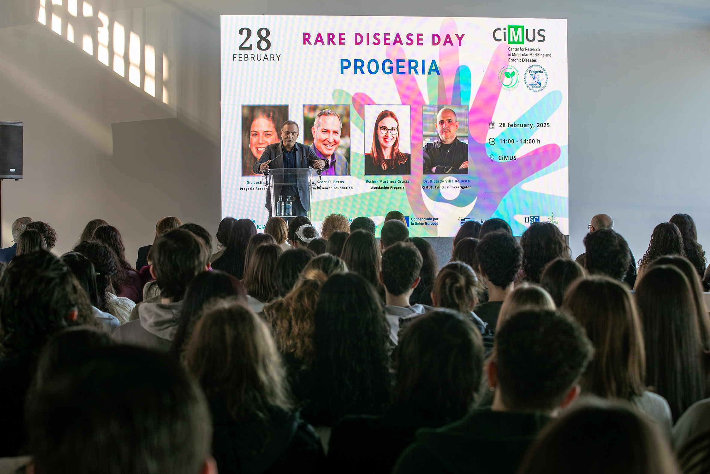 No Día Mundial das Enfermidades Raras, baixo o liderado do CiMUS da USC, a comunidade científica e familiares de menores afectados reuníronse este venres en Santiago para artellar unha fronte común que conciencie sobre a necesidade de acurtar os prazos actuais de diagnóstico e a importancia da investigación para mellorar a calidade de vida de quen padecen esta enfermidade rara. Participaron nese encontro científico referentes mundiais como Scott D. Berns e Leslie B. Gordon, co fundadores da Progeria Research Foundation (USA), organización pioneira na investigación e desenvolvemento de tratamentos, e Esther Martínez Gracia, co fundadora da Asociación Progeria en España. Interviñeron ademais no acto, entre outros, o vicerreitor de Transformación Dixital e Innovación, Gumersindo Feijoo, e a directora do CiMUS, Mabel Loza.