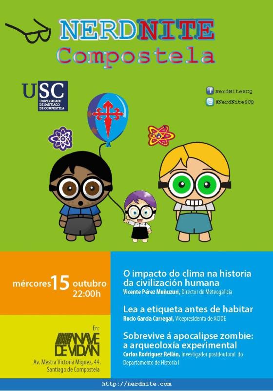 Os amantes da ciencia e a diversión teñen este mércores 15 unha nova ocasión para escoitar as charlas que tres apaixonados expertos ofrecerán ás 22.00 horas na Nave de Vidán. O director de Meteogalicia, Vicente Pérez Muñuzuri, falará do impacto do clima na historia da civilización humana, mentres que a vicepresidenta da asociación sociocultural Acide, Rocío García Garregal, intervirá coa charla ‘Lea a etiqueta antes de habitar’. Por último, o investigador do Departamento de Historia I Carlos Rodríguez Rellán preséntase co suxerinte título ‘Sobrevive á apocalipse zombie: a arqueoloxía experimental’. Nerd As NerdNites son unha proposta nacida hai anos en Estados Unidos e á que se sumou Santiago en 2012, sendo a primeira cidade española en facelo. Articúlase en base a pequenas charlas científicas con contidos chamativos, onde especialistas dialogan co público das disciplinas que lles apaixonan fóra do ámbito académico, nun ton distendido e en horario nocturno.