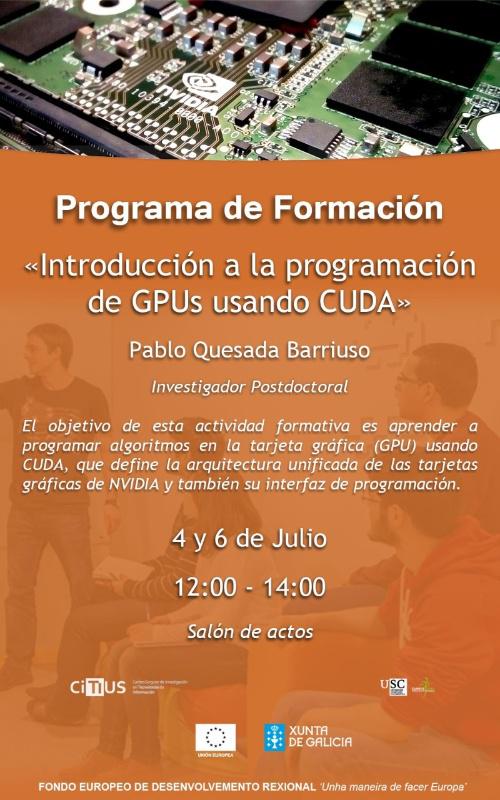 Os programadores teñen unha cita no CiTIUS a vindeira semana. Entre as 12.00 e as 14.00 horas do martes 4 e o xoves 6 de xullo, o investigador Pablo Quesada conducirá unha nova edición do Programa de Formación do centro. O obxectivo é facilitar aos participantes os coñecementos necesarios para aprender a programar algoritmos en tarxetas gráficas (ou GPUs) empregando CUDA, unha plataforma de computación paralela que define a arquitectura unificada das tarxetas gráficas de NVIDIA e tamén a súa interface de programación.