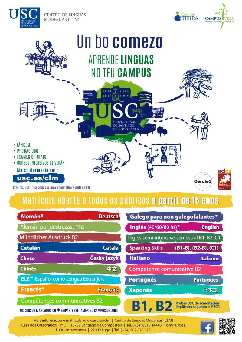 Probas de competencia Ademais da súa oferta de idiomas estable ao longo de todo o curso, o CLM é o centro examinador para a comunidade universitaria da USC de alemán, inglés, francés, italiano e portugués en Santiago e de alemán, inglés, francés en Lugo para as probas B1 e B2.
