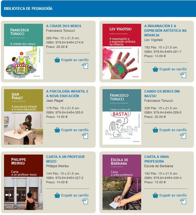 Esta colección acubilla ata o momento un total de oito títulos de relevancia dentro do ámbito específico de Pedagoxía agora traducidos ao galego. Entre outros figuran obras de Francesco Tonucci (A cidade dos nenos e Cando os nenos din basta!), Jean Piaget (A psicoloxía infantil e a nova educación), Maria Montessori (Educación para un mundo novo), Paulo Freire (Pedagoxía do oprimido), Lev Vigotski (A imaxinación e a expresión artística na infancia), Philippe Meirieu (Carta a un profesor mozo) e o libro Carta a unha profesora, texto escrito por nenas, nenos e adolescentes dunha escola rural italiana entre 1966 e 1967 para denunciar a selectividade social que impón un modelo de educación clasista e conservadora.
