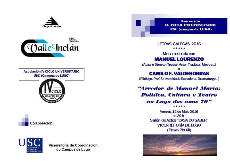 A Asociación do IV Ciclo Universitario do campus de Lugo e o Club Cultural Valle Inclán celebran este venres, a partir das 20.00 horas, no auditorio da Casa do Saber, a mesa de debate ‘Arredor de Manuel María: Política Cultura e Teatro no Lugo dos anos 70’. O coloquio, organizado co gallo da celebración do Día das Letras Galegas, unha efeméride que na súa edición de 2016 rende homenaxe ao poeta chairego, contará como relatores co mestre e dramaturgo Manuel Lourenzo e co filólogo e profesor da Universidade de Barcelona Camilo Fernández Valdehorras.