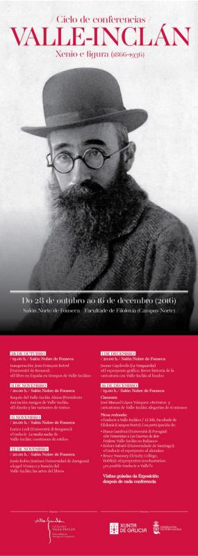 O programa de actos previsto pola Cátedra Valle-Inclán da USC para conmemorar o 150 aniversario do nacemento do autor galego dará comezo este venres 28 coa inauguración, ás 19.00 horas no Colexio de Fonseca, da exposición ‘Valle-Inclán, Xenio e figura (1866-1936)’.