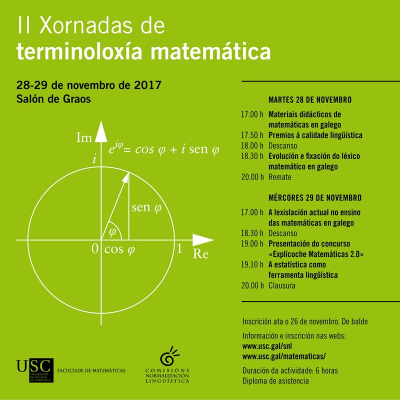 A Facultade de Matemáticas abre as súas portas este martes 28 e o mércores 29 ás segundas Xornadas de terminoloxía matemática. Celebrarase en horario de 17.00 a 20.00 horas, no Salón de Graos do centro cun programa que permitirá reflexionar sobre a implantación da lingua galega nesta ciencia e máis no seu ensino.