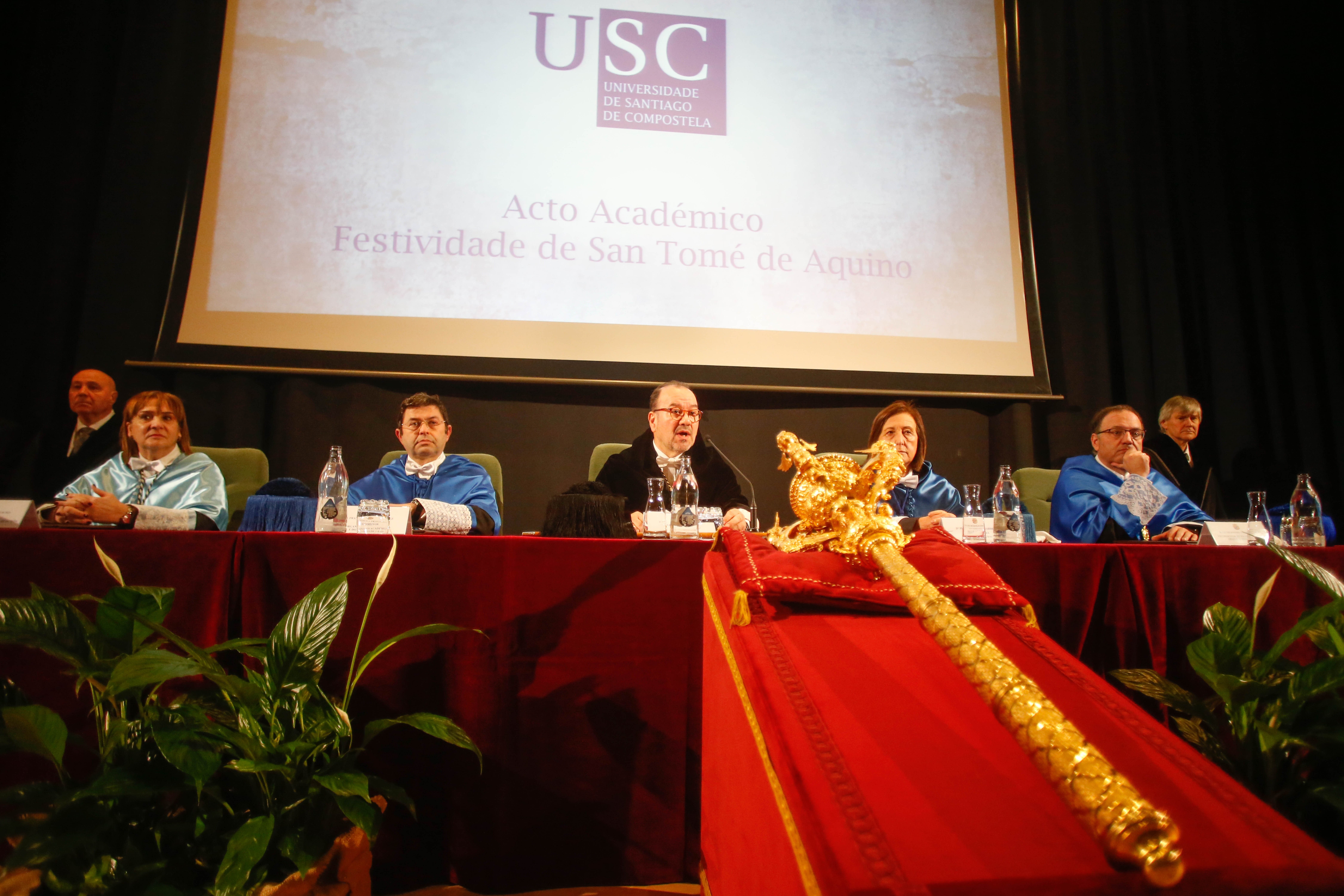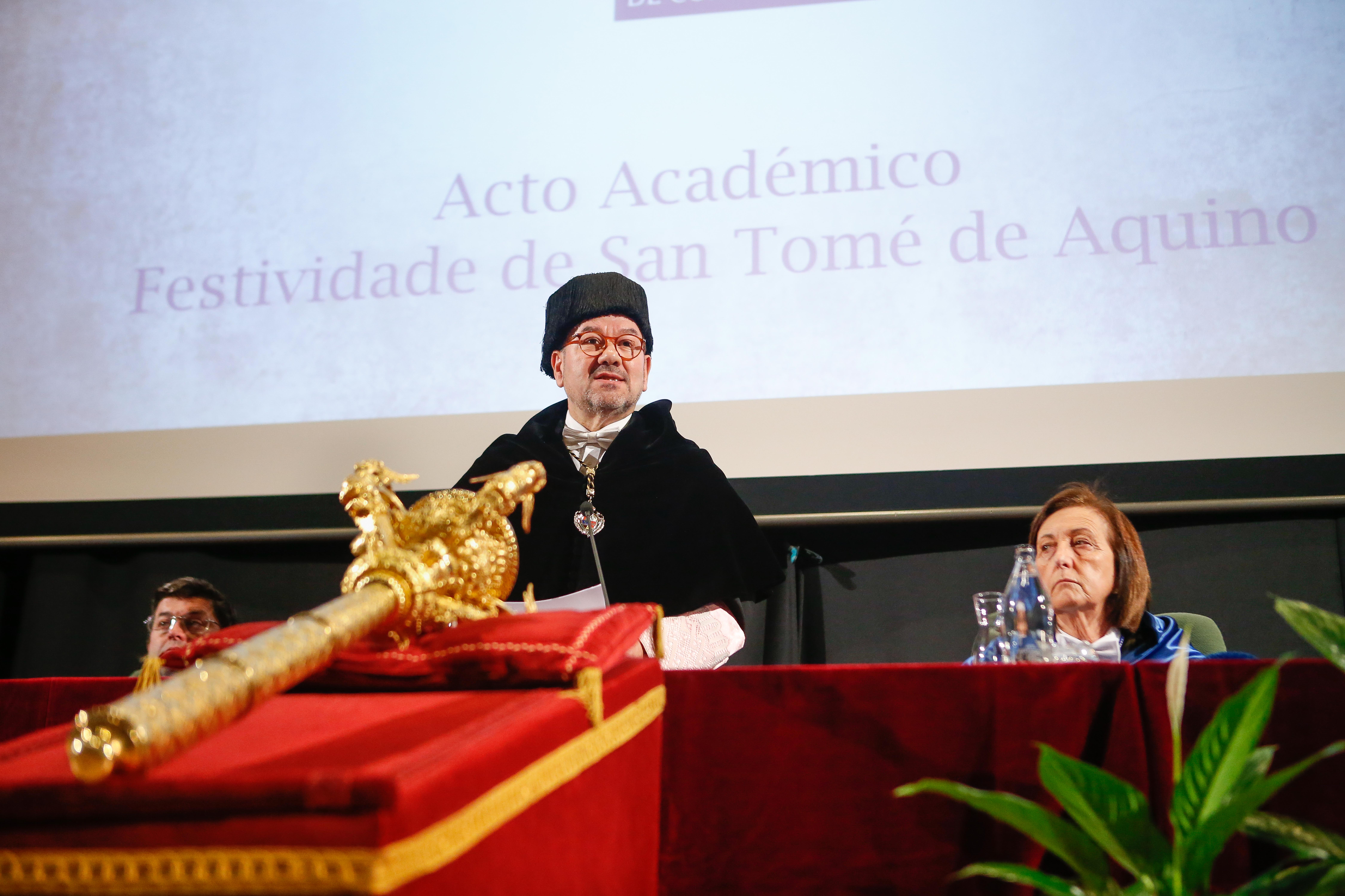 A cerimonia académica conmemorativa da festividade de San Tomé de Aquino congregou no auditorio da Facultade de Veterinaria unha ampla representación do equipo de goberno da USC, entre os que cabe citar a presenza do vicerreitor de Organización Académica e Campus de Lugo, Francisco Fraga; a secretaria Xeral da USC, Dulce García Mella, e o xerente da institución, Javier Ferreira, ademais de delegados do reitor, decanos e directores de centros universitarios e membros do Consello Social da USC.