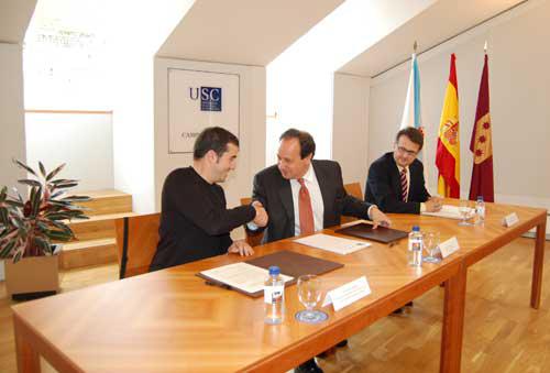 Momento no que Carlos Herrero (centro) e Pablo González formalizan o compromiso de colaboración das dúas entidades. Á dereita, Javier Bueno