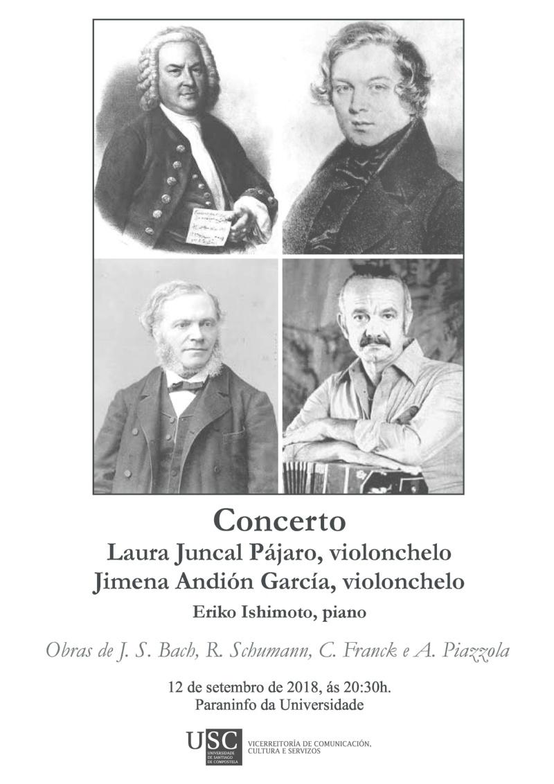 As violonchelistas Laura Juncal Pájaro e Jimena Andión García, acompañadas de Eriko Ishimoto ao piano, ofrecen este mércores 12 un concerto no que interpretarán obras de Johann Sebastian Bach, Robert Schumann, Cesar Franck e Astor Piazzola. Con entrada libre, o recital será ás 20.30 horas no Paraninfo da Universidade.