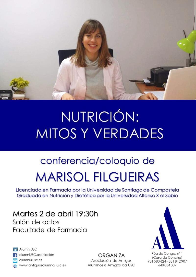 Alumni USC organiza este martes 2 a conferencia-coloquio ‘Nutrición: mitos e verdades’ que impartirá a nutricionista Marisol Filgueiras a partir das 19.30 horas no Salón de Graos da Facultade de Farmacia. A charla servirá para abordar a nutrición poñendo límites aos falsos mitos e confrontándoos coas certezas respecto da súa incidencia na saúde. Marisol Filgueiras é licenciada en Farmacia pola USC e graduada en Nutrición en Dietética pola Universidade Alfonso X El Sabio.