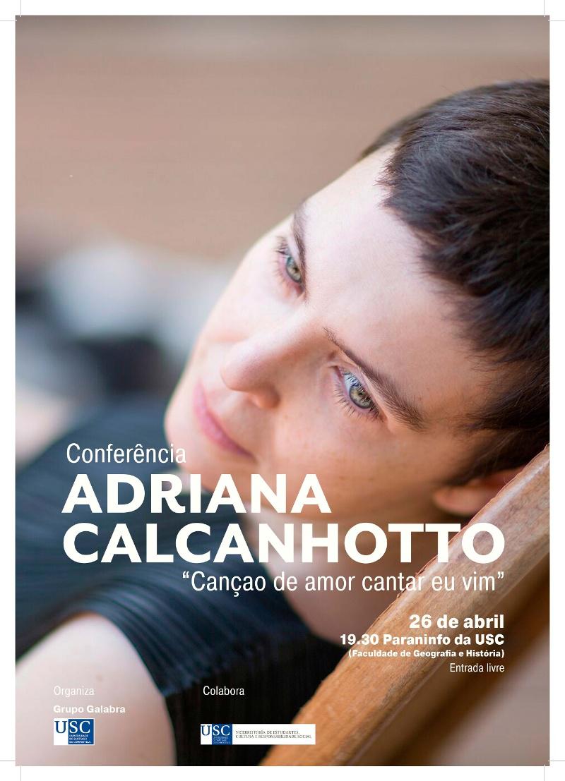 Aproveitando o seu concerto en Santiago o día 27, a artista brasileira Adriana Calcanhotto ofrecerá este xoves 26 unha conferencia no Paraninfo da Universidade organizada polo Grupo Galabra da USC coa colaboración da Vicerreitoria de Estudantes, Cultura e Responsabilidade Social. O relatorio, ás 19.30 horas e de entrada libre, leva por título ‘Canção de amor cantar eu vim’ e contará coa presentación da profesora da USC Carmen Villarino Pardo.