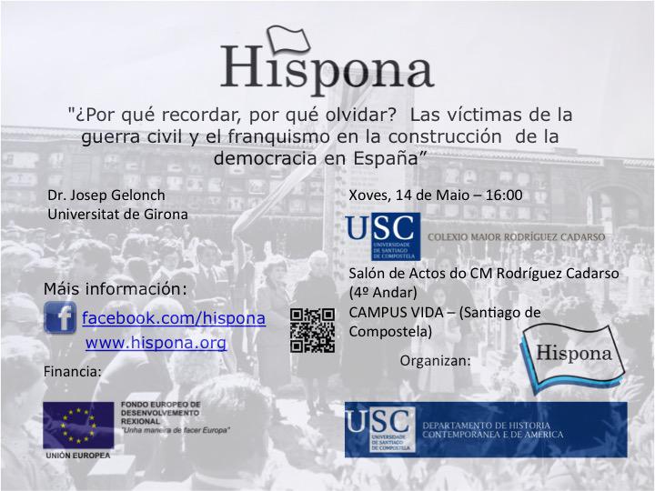 En torno á memoria histórica xirará a conferencia que o profesor Josep Gelonch, da Universidade de Girona, impartirá este xoves 14 ás 16.00 horas no salón de actos do Colexio Maior Rodríguez Cadarso (Praza Rodríguez Cadarso S/N, Campus Vida). A conferencia, titulada ‘¿Por qué recordar, por qué esquecer? As vítimas da guerra civil e o franquismo na construción da democracia en España’, forma parte das actividades que organiza o grupo de investigación da USC Hispona que estuda os aspectos políticos, culturais e sociais do mundo urbano do século XX. Josep Gelonch é doutor en historia contemporánea pola Universidade de Lleida e investigador posdoutoral na London School of Economics and Political Science.
