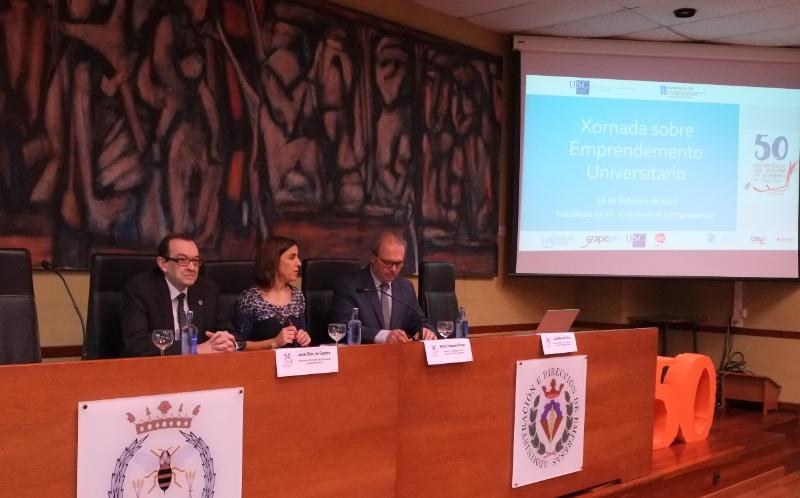 Deste cada vez maior desexo de emprender da mocidade universitaria falouse esta mañá nunha xornada na Facultade de Ciencias Económicas e Empresariais da USC, que este curso conmemora os 50 anos dos estudos de Economía en Galicia. A sesión, organizada en colaboración con GEM Galicia, inaugurárona o secretario xeral de Universidades, José Díez de Castro; o adxunto ao reitor para Transferencia, Innovación e Emprendemento, José M. Cotos, e a decana do centro, Emilia Vázquez.