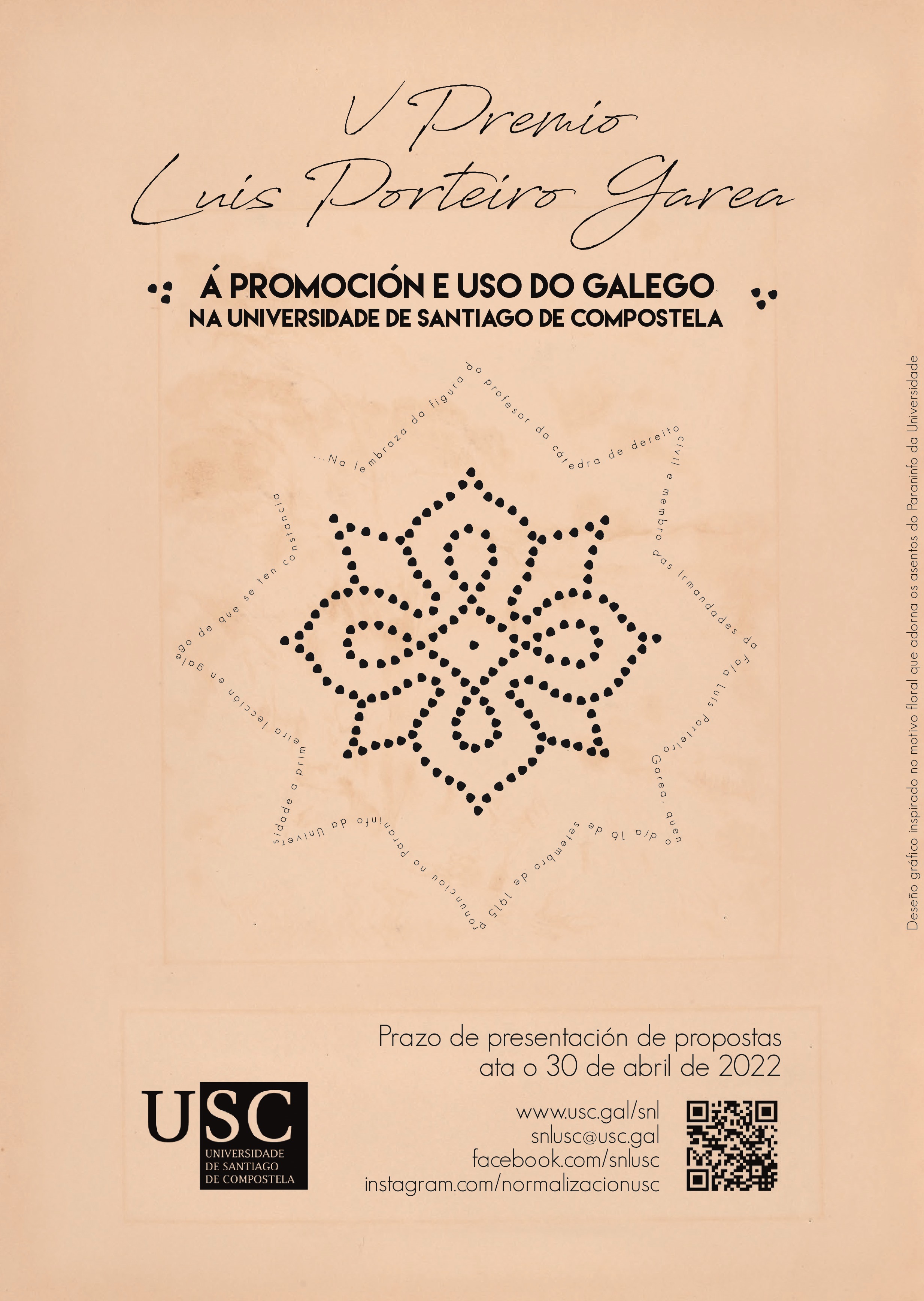 O V Premio ‘Luís Porteiro Garea’ recoñecerá a iniciativa, o traballo e a traxectoria da comunidade universitaria presente e pasada a prol da normalización do galego na universidade. Deste xeito, serán valoradas aquelas iniciativas relacionadas co emprego habitual da lingua na institución universitaria; as achegas realizadas á promoción do idioma ou á galeguización de ámbitos e actividades na USC; o estudo e difusión do idioma galego; ou calquera outra iniciativa que sexa considerada relevante neste eido. Nas anteriores edicións deste premio foron recoñecidos Manuel Bermejo, Xosé Antonio Gómez Segade, Antón Costa Rico e Antonio Rigueiro, catedráticos de Química Orgánica, Dereito Mercantil, Historia da Educación e Enxeñaría de Montes, respectivamente.
