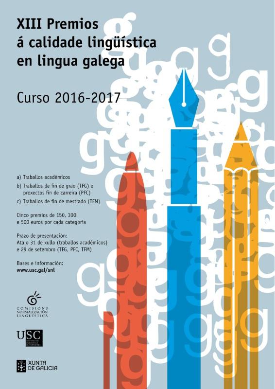 A USC convoca unha nova edición dos ‘ Premios á calidade lingüística’, co obxectivo de fomentar o uso do galego entre o alumnado ligado ao espallamento da cultura da calidade na elaboración e defensa dos seus traballos. Prémianse os mellores traballos académicos, proxectos de fin de carreira (PFC) ou traballos de fin de grao (TFG) e traballos de fin de mestrado (TFM) redactados en galego neste curso académico 2016-2017.