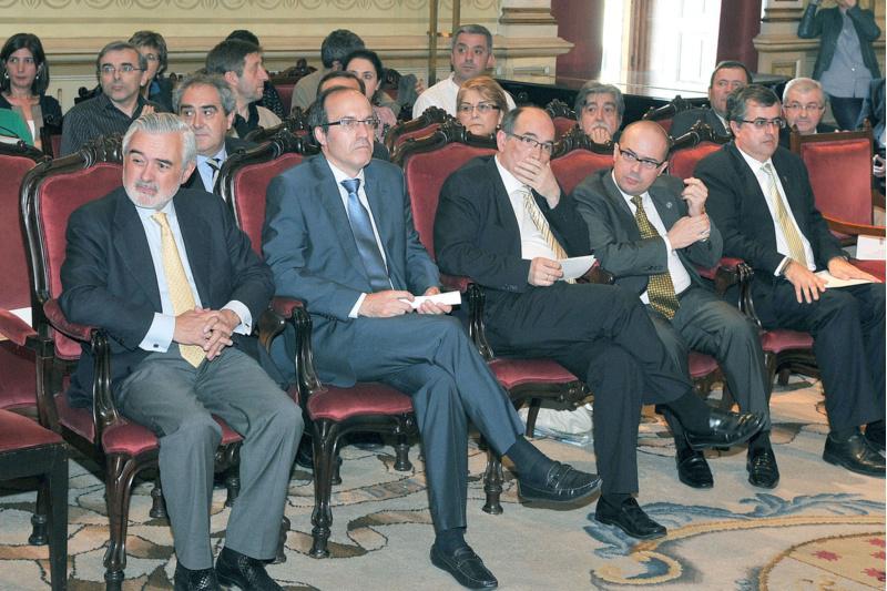 Diante da placa conmemorativa, de esquerda a dereita, Xosé Luis Couceiro, Rosario Álvarez, Ramón Lorenzo, Antón Santamarina, Xerardo Fernández Albor e Juan Casares Long