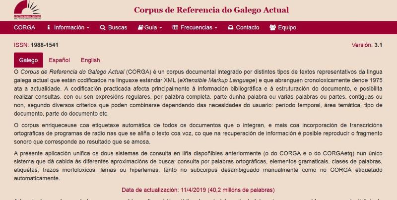 Dentro do convenio que manteñen a USC e o Centro Ramón Piñeiro para a investigación en Humanidades, o Corpus de Referencia do Galego Actual (CORGA) acaba de presentar a súa nova versión 3.1 e o etiquetador/lematizador Xiada a súa versión 2.7. A dirección e coordinación destas dúas liñas de traballo corresponde aos docentes de Filoloxía Guillermo Rojo e María Sol López Martínez.
