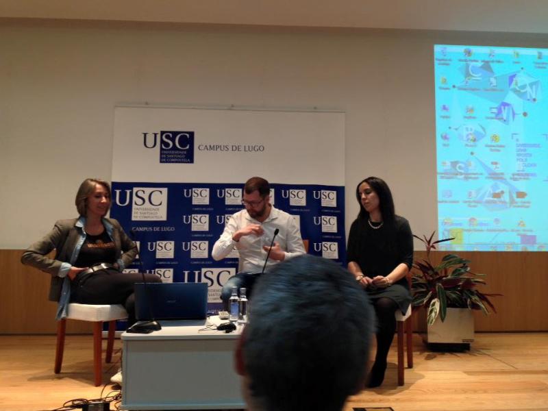 Fran Quiroga, no centro, nunha das conversas do CulturaLab na Casa do Saber de Lugo