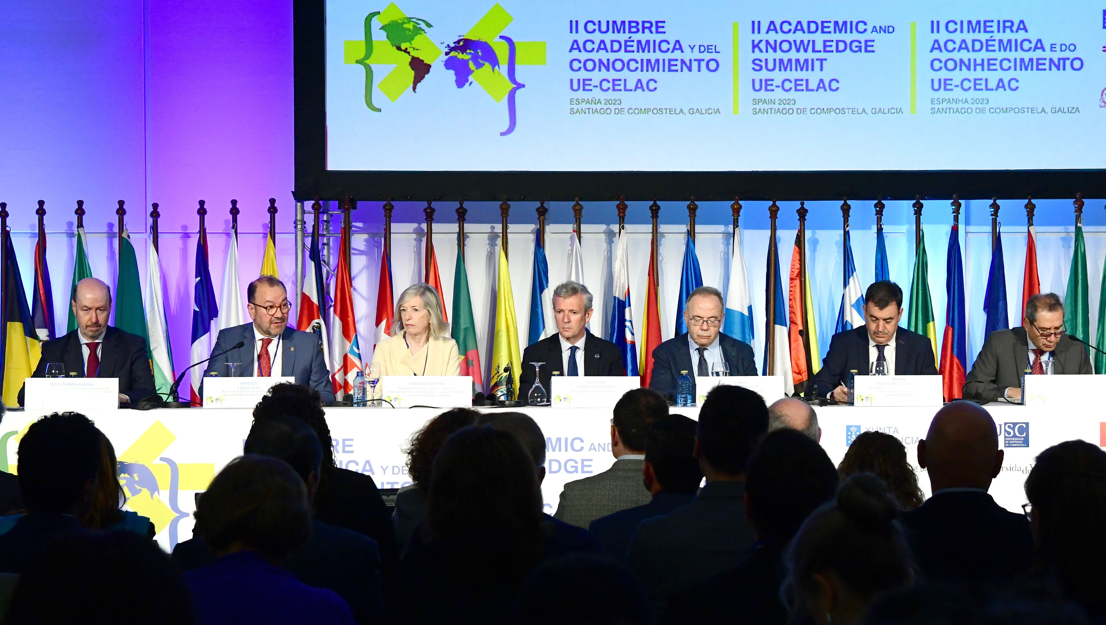 Antes de impartir o relatorio inaugural do cumio, Stefania Giannini, subdirectora xeral de Educación da UNESCO, lembrou que Galicia é “terra de grandes pensadoras como Emilia Pardo Bazán, Rosalía de Castro e Concepción Arenal, as cales moveron os límites a favor das mulleres”. Giannini  destacou que a UNESCO segue traballando a prol dun mundo “máis xusto a través da educación”. A continuación, Ralph Gonsalves, primeiro ministro de San Vicente y las Granadinas e presidente da Comunidade de Estados Latinoamericanos e Caribeños (CELAC) deu a benvida a todas as persoas participantes a través dun vídeo gravado expresamente para a inauguración do cumio. O presidente da Xunta de Galicia, Alfonso Rueda, acompañado polo conselleiro de Cultura, Educación, FP e Universidades, Román Rodríguez, pechou a sesión de apertura lembrado os 500 anos de “relacións moi frutíferas” entre os dous continentes. O presidente subliñou que a Xunta sempre apoiará os espazos de “cooperación, fraternidade e construción”.
