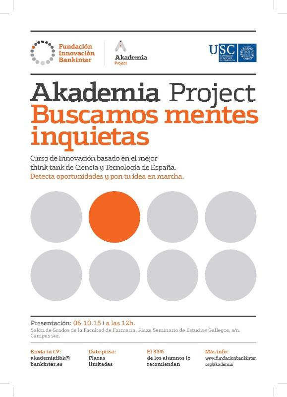 A USC e a Fundación Innovación Bankinter promoven a sétima edición de Akademia Project, un curso que busca estimular a actitude innovadora e espertar o espírito emprendedor entre estudantes das principais universidades españolas. As persoas que o cursen terán a oportunidade de vivir o proceso completo de innovación, desenvolvendo un proxecto emprendedor coa axuda de emprendedores e business angels. A través dun programa único, esta iniciativa aposta por unha formación diferente enfocada a desenvolver o pensamento creativo e a resolución de problemas con respostas innovadoras que acheguen valor. Ao longo do curso analizaranse tendencias clave de innovación na actualidade, da man de profesionais e emprendedores de primeiro nivel. Ademais, ao rematar o curso, poderán realizarse prácticas en empresas nacionais e internacionais que apostan pola innovación. Akademia Project, unha iniciativa de carácter gratuíto, diríxese a estudantes de últimos cursos de calquera titulación universitaria que participarán en doce sesións ao longo de todo o curso, catro delas reservadas para que o alumnado desenvolva un proxecto emprendedor que será presentado na sesión de clausura ante un xurado formado por expertos, emprendedores e potenciais inversores. Para formalizar a inscrición en Akademia Project hai que enviar un currículo a akademiafibk [at] bankinter.es (akademiafibk[at]bankinter[dot]es) antes do 11 de outubro. Ademais, o próximo día 6 de outubro, ás 12.00 horas no Salón de Graos da Facultade de Farmacia, está prevista unha sesión de presentación para todo o alumnado interesado. O curso desenvólvese en diversas universidades de toda España, e no caso da institución compostelá conta co apoio da Área de Valorización, Transferencia e Emprendemento da USC (AVTE). Os/as participantes aprenderán dun xeito colaborativo e moi participativo a partir dunha metodoloxía innovadora baseada na utilizada por algunhas das mellores escolas de negocio do mundo. O 93% do alumnado que ten pasado en edicións anteriores por esta convocatoria, algo máis de 1.000 universitarios e universitarias de titulacións diversas, recomendan esta iniciativa, destacando que Akademia lles ofrece ferramentas, conceptos e técnicas enfocadas á innovación con independencia da rama de procedencia das persoas interesadas.