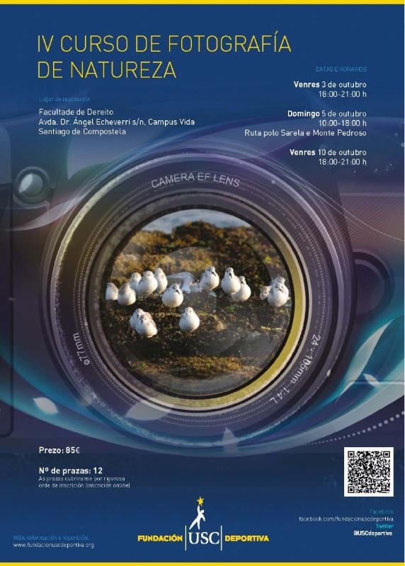 A Fundación USC Deportiva organizará o vindeiro mes de outubro en Santiago de Compostela un novo curso de fotografía de natureza no que se transmitirán as pautas básicas desta modalidade que vai dende a fotografía de paisaxe á de plantas e animais. O curso impartirao o fotógrafo Andrés Fraga, profesor de Fotografía Contemporánea na Facultade de Xornalismo da USC ademais de contar con máis de 10 anos de experiencia como profesional e de ter traballado para El País así como para varias publicacións estranxeiras. Todos as persoas interesadas en participar deberán formalizar a súa inscrición a través da páxina web da web da Fundación www.fundacionuscdeportiva.org. O custe do curso é de 85 € e as prazas son limitadas (máximo doce participantes) polo que se recomenda realizar a reserva de praza o antes posible xa que se respectará rigorosamente a orde de inscrición para a súa adxudicación. O curso constará de tres sesións. A primeira delas, o venres 3 de outubro, será teórica e nela revisaranse as principais técnicas e métodos dos diferentes tipos de fotografía de natureza. A seguinte, o domingo 5 de outubro, consistirá nunha ruta guiada por un monitor coa finalidade de que durante o percorrido se apliquen as técnicas explicadas con anterioridade e ademais promover a realización de fotografías para que o alumnado experimente co medio natural e deste xeito poidan xurdir dúbidas que resolverá o profesor e que facilitarán a aprendizaxe. Na terceira parte do curso, a desenvolver o venres 10 de outubro, visualizaranse as imaxes que se realizaron na saída previa e farase unha posta en común das fotografías que se comentarán en conxunto coa finalidade de reforzar os coñecementos aprendidos nas sesións anteriores. A duración total do curso será de 14 horas e as sesións desenvolveranse na aula 5 da Facultade de Dereito a excepción do roteiro que se desenvolverá no Sarela e Monte Pedroso. Pódese ampliar a información sobre esta e outras actividades da Fundación USC Deportiva a través da páxina web www.fundacionuscdeportiva.org.