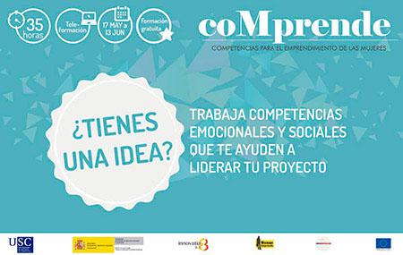 Con carácter gratuíto, en formato de teleformación e cunha carga lectiva de 35 horas, o curso ‘ coMprende. Competencias necesarias para o Emprendemento das Mulleres’ é unha iniciativa formativa que se vai celebrar entre o 17 de maio e o 13 de xuño. Diríxese a mulleres do ámbito universitario que desexen desenvolver as competencias necesarias para emprender, dende un enfoque emocional e de xénero; estudantes ou tituladas con intención de poñer en marcha unha idea de negocio ou consolidar unha actividade empresarial; así como a integrantes de grupos de investigación de alto rendemento con intención de poñer en marcha unha iniciativa empresarial. O prazo de inscrición rematará o próximo luns 16.
