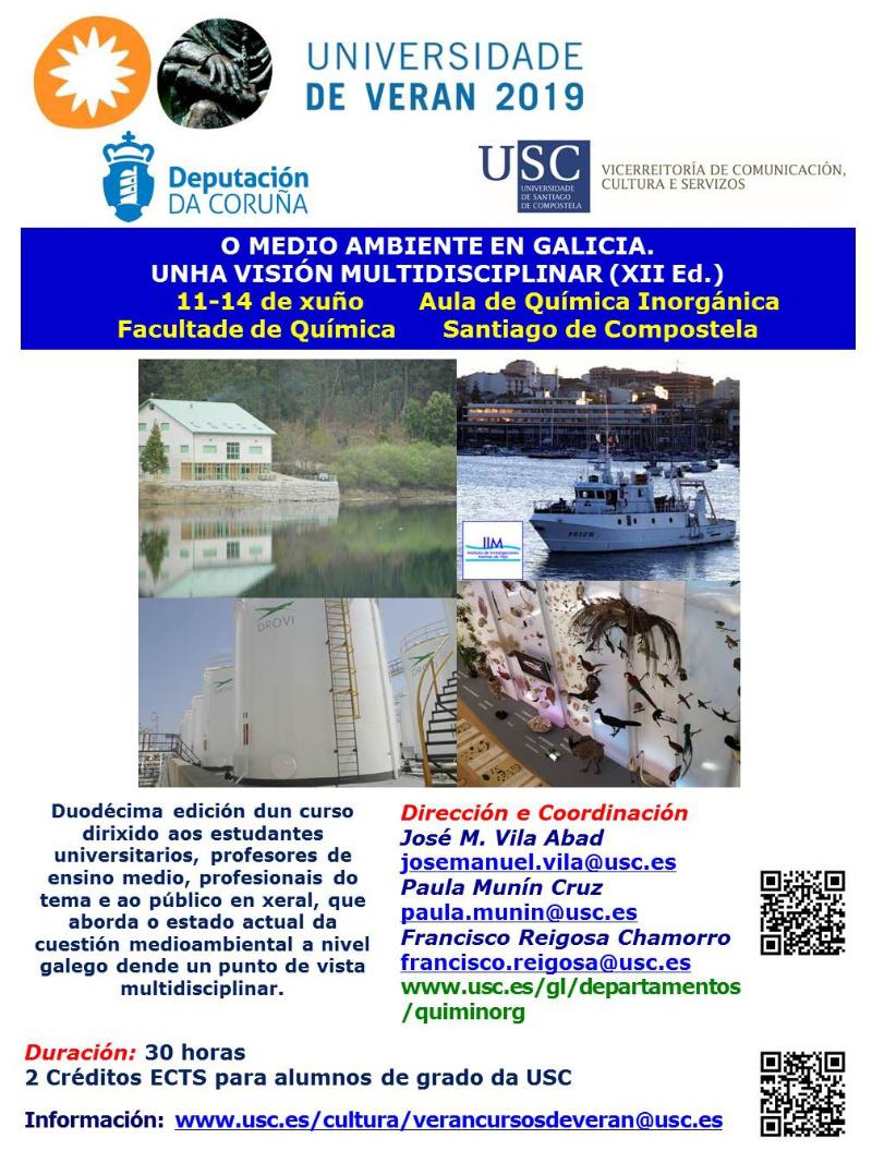 Dirixido por José Manuel Vila Abad e con cofinanciamento da Deputación da Coruña, o curso O medioambiente en Galicia. Unha visión multidisciplinar (XII Ed.) diríxese a alumnado universitario, docentes de ensino medio, profesionais e público en xeral interesado nos aspectos físicos, químicos e biolóxicos da contaminación, no cambio climático, na contaminación das augas, nos residuos, na economía medioambiental e no crecemento sostible, entre outras cuestións.