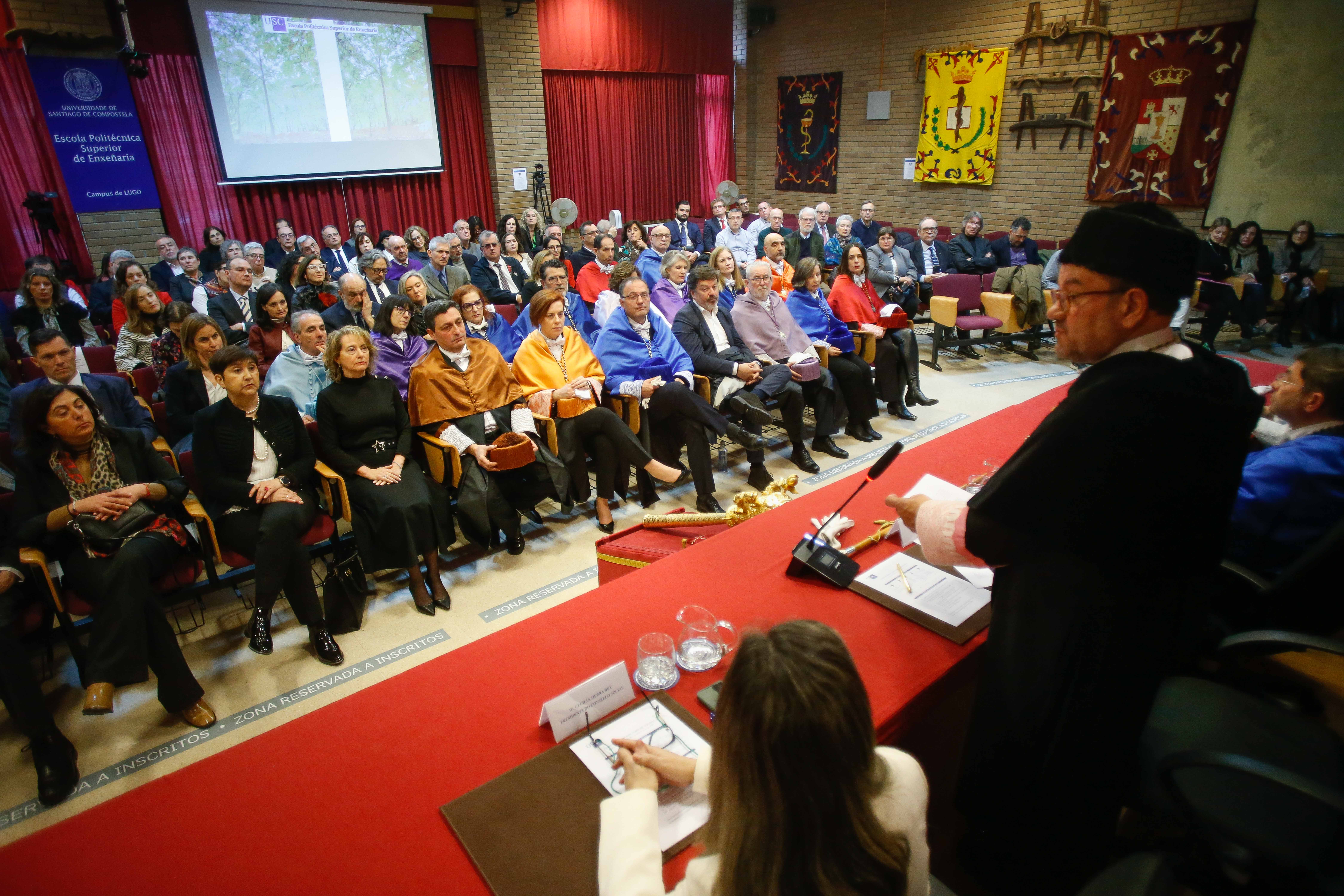 Acompañaron o reitor na mesa presidencial o vicerreitor de Organización Académica e do Campus de Lugo, Francisco J. Fraga López; a vicerreitora de Titulacións e Internacionalización, María José López Couso; a vicerreitora de Política Científica, Pilar Bermejo Barrera; e a presidenta do Consello Social, Cecilia Sierra Rey. A lección maxistral correu a cargo do profesor Roque Julio Rodríguez Soalleiro, catedrático de Produción Vexetal, e versou sobre o tema 'Entre carballos e castiñeiros: xestión activa para producir madeira de calidade'.