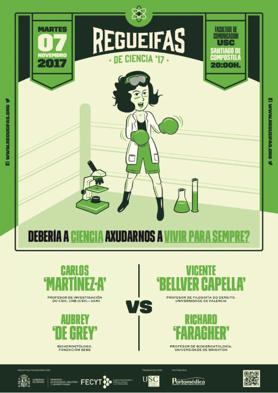 Catro expertos, dúas posturas claramente enfrontadas e unha pregunta: debería a ciencia axudarnos a vivir para sempre? Así se presenta a Regueifa de Ciencia que terá lugar este martes 7 ás 20.00 horas na Facultade de Ciencias da Comunicación. Trátase da primeira ‘regueifa’ de carácter internacional, de maneira que a xornada se desenvolverá en español e en inglés, con sistema de tradución simultánea para quen o desexe, ademais de ser retransmitido en directo por USC TV (http://tv.usc.es/directo4.html en inglés).