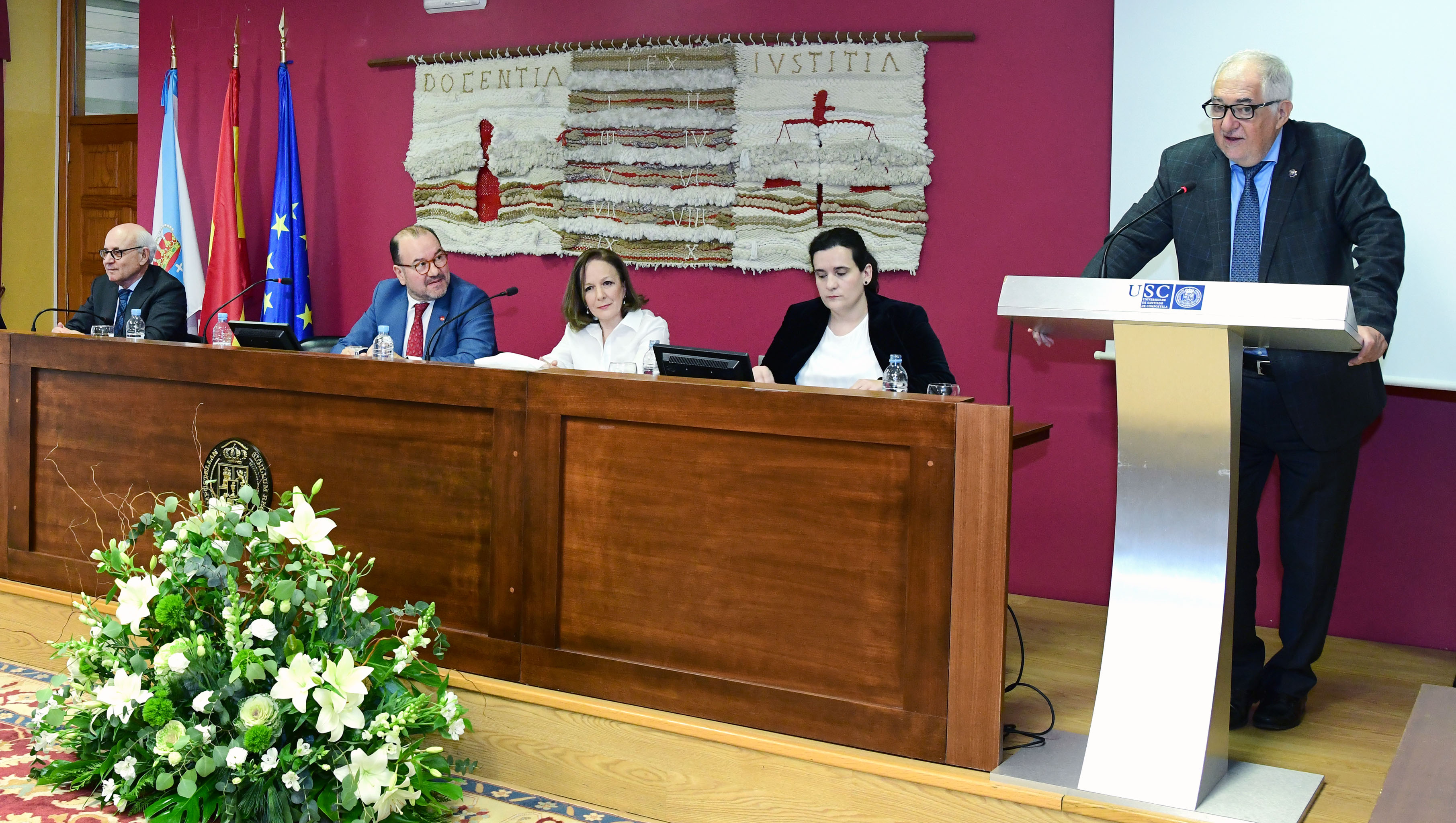 O presidente do Tribunal Constitucional, Cándido Conde-Pumpido Tourón, pronuncia a súa lección maxistral. Na mesa, desde a esquerda, o fiscal xefe do Tribunal Superior de Xustiza de Galicia, Fernando Suanzes, o reitor Antonio López, a decana Ana María Gude e a secretaria da Facultade, Natalia Pérez. FOTO: Santi Alvite