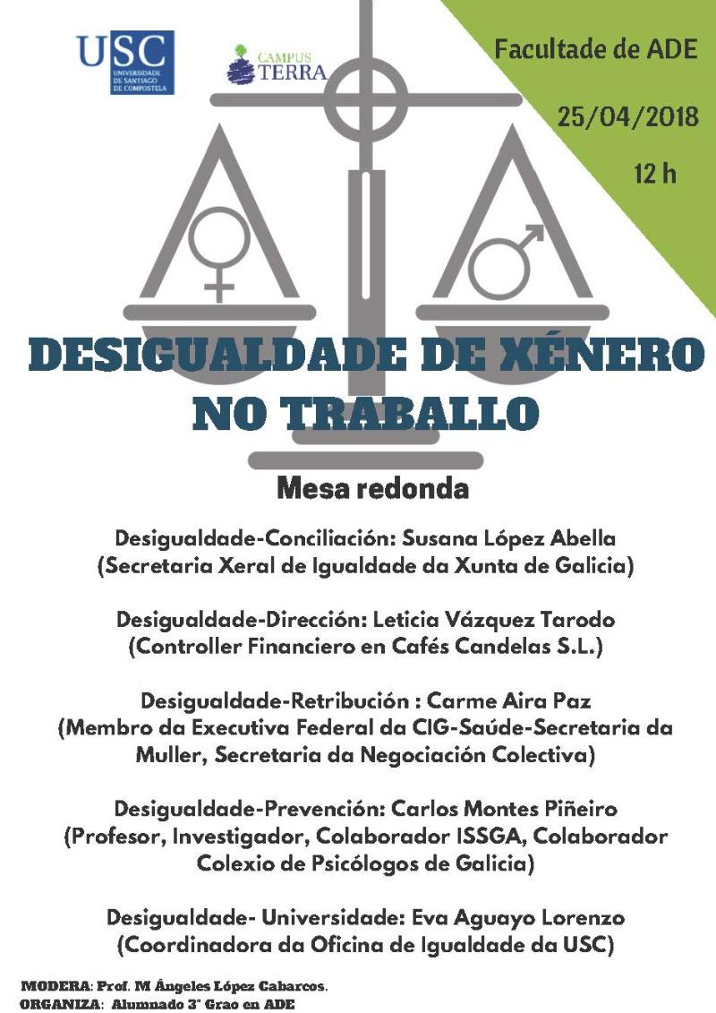 A desigualdade de xénero no ámbito laboral centra este mércores a temática dunha mesa de debate que se desenvolverá a partir das 12.00 horas no Salón de Graos da Facultade de Administración e Dirección de Empresas do Campus Terra da USC. Esta sesión, promovida polo alumnado de terceiro curso do grao en ADE no marco dun estudo sobre a relación das persoas no ámbito organizativo, estará moderada pola profesora Ángeles López Cabarcos e contará como relatores con cinco persoas representativas de ámbitos profesionais e laborais diversos.