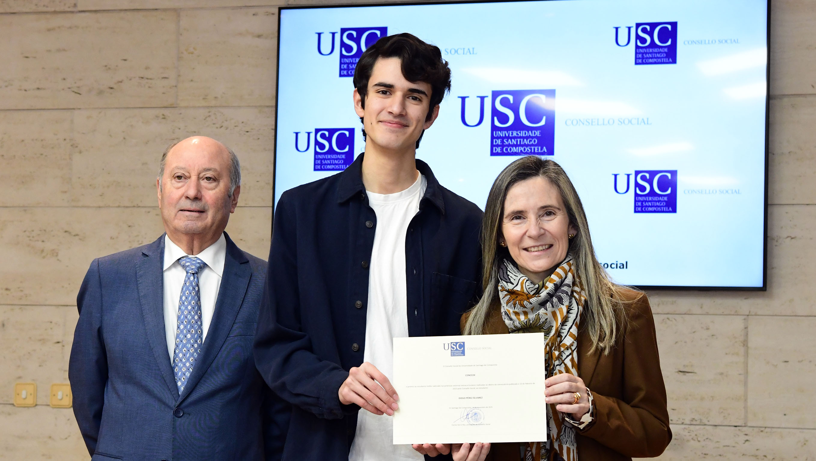 O estudante do Grao en Enxeñaría Informática Diego Pérez Álvarez recolleu este xoves da man da presidenta do Consello Social, Cecilia Sierra Rey, o premio por ter conseguido a mellor valoración nas prácticas externas extracurriculares deste órgano de goberno universitario.