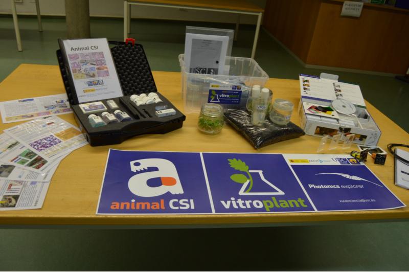 As tres unidades ou kits educativos elaborados ata a data na USC no marco do proxecto ‘ Xuvenciencia na aula’, ‘Animal CSI’, ‘Vitroplant’ e ‘Photonic Explorer’, teñen unha marcada orientación científica e tecnolóxica, polo que o se antollan como ferramentas educativas e didácticas acaídas para profesorado de ensino medio das áreas de Física, Química, Bioloxía, Tecnoloxía... Os centros educativos presentes nesta edición de ‘Xuvenciencia para profesorado’ recibiron de xeito gratuíto cadanseu kit educativo a demanda do profesorado asistente. O kit 'Animal CSI' inclúe diversas actividades para desenvolver na aula no ámbito da patoloxía veterinaria, como necropsias ou preparación de mostras para a súa avaliación no microscopio. 'Vitroplant' é outra das unidades deseñadas polo profesorado do campus de Lugo da USC na que se inclúen actividades para o cultivo in vitro de árbores, mentres que ‘Photonics Explorer’ e e inclúe material para facer oito experimentos sobre a luz e a tecnoloxía da luz. Os docentes dos centros educativos de ensino medio de Galicia que traballarán nas súas respectivas aulas con estas unidades educativas desenvolvidas por profesorado do campus de Lugo recibiron formación específica para o aproveitamento deste material didáctico no marco da xornada ‘ Xuvenciencia para profesorado’, un foro de comunicación e información entre profesorado de ensino secundario e universitario avalado pola Fecyt e orientado a fomentar vocacións científico-técnicas e científico-sociais do alumnado preuniversitario. A vicerreitora de Servizos Universitarios do campus de Lugo da USC, Carme Silva Domínguez; a coordinadora do grupo da USC Xuvenciencia, Mercedes Novo, e o coordinador do programa ‘A Ponte’, no campus de Lugo, Francisco Javier López, foron os responsables da apertura deste foro, no que participaron máis de 30 docentes de ensino medio. No marco deste e a través do que a USC busca achegar ás aulas o traballo cotiá de docencia e investigación que se desenvolve nas aulas e laboratorios universitarios do campus de Lugo. De xeito parello ao desenvolvemento destas sesións prácticas encamiñadas a ofrecer formación para un aproveitamento óptimo dos kits educativos de carácter científico e tecnolóxico desenvolvidos na USC, o programa ‘Xuvenciencia para profesorado’ incluíu tamén sesións específicas para profesorado de áreas de coñecemento ligadas ás ciencias sociais. Nestas sesións específicas, profesores e investigadores da USC pertencentes ás áreas de Administración de empresas, Debuxo, Economía, Filosofía, Lingua e literatura galega, Lingua castelá e literatura, Xeografía e Historia, presentaron as liñas de investigación nas que están a traballar, ao tempo que sentaron as bases cara o posible desenvolvemento de accións conxuntas entre a USC e os centros de ensino medio, así como para o desenvolvemento futuro de unidades educativas ligadas a estas áreas do saber. De esquerda a dereita, Novo, Silva e López, na apertura das xornadas Kits educativos deseñados no marco do proxecto 'Xuvenciencia na aula'