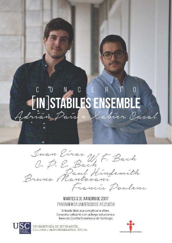 Os saxofonistas Adrián Pais e Xabier Casal fundaron en 2015 o [in]stabiles ensemble, unha formación que o vindeiro martes, 3 de xaneiro, actuará ás 20.00 horas no Paraninfo da Universidade (Facultade de Xeografía e Historia). A entrada é libre e gratuíta, aínda que quen o desexe poderá facer unha achega a favor da Cociña Económica de Santiago.