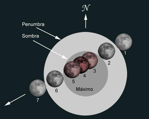 O comezo da eclipse penumbral terá lugar ás 21:16, comezando a ser parcial ás 22:30 e total ás 23:44 do sábado. O medio da eclipse producirase ás 0:21 horas do domingo, finalizando a total ás 00:58 e a penumbral ás 3:25 horas.