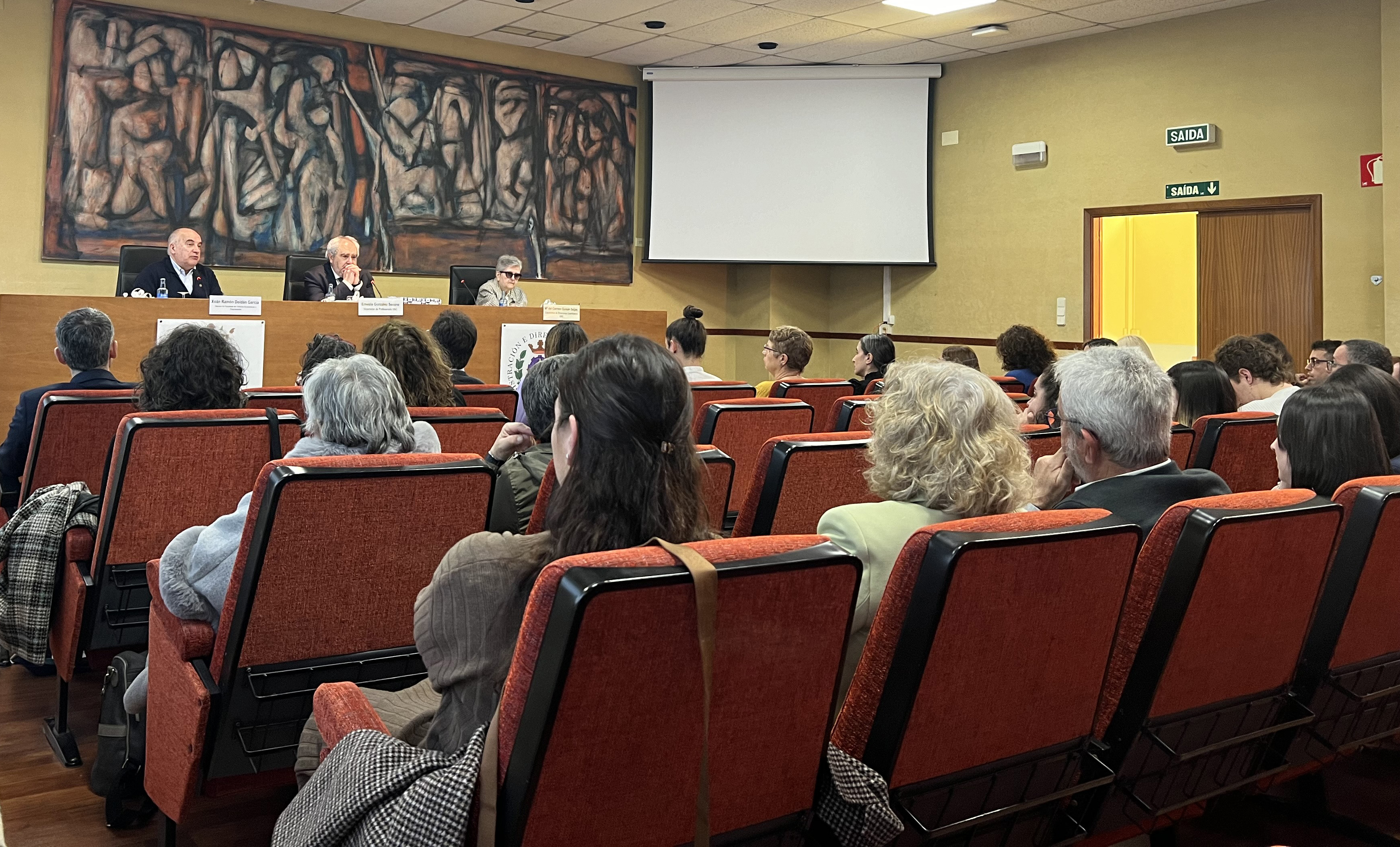 Xoán Doldán, esquerda, Ernesto González Seoane e María del Carmen Guisán Seijas nun momento do evento