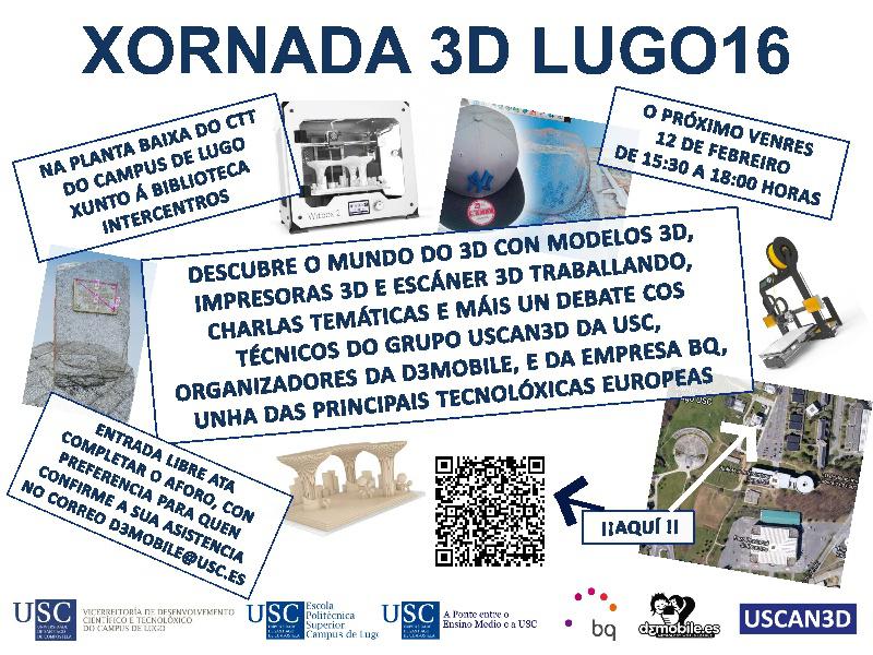 A xornada é de carácter gratuíto e está aberta á participación de todo o público interesado nesta temática, aínda que terán preferencia as persoas que formalicen previamente a súa inscrición a través do enderezo de correo electrónico d3mobile [at] usc.es (d3mobile[at]usc[dot]es). Esta sesión informativa e divulgativa sobre o mundo 3D e as múltiples posibilidades que ofrece esta tecnoloxía antóllase como un foro aberto que inclúe, ademais dun obradoiro de carácter práctico, relatorios e debates guiados polos investigadores do grupo USCAN3D da USC e por persoal da empresa tecnolóxica BQ. A organización desta actividade específica encádrase no marco do ‘Curso práctico de modelado e impresión 3D con software gratuíto’, unha actividade formativa de carácter monográfico promovido polo grupo USCAN3D da USC en colaboración da firma BQ e que reúne 20 participantes desde este xoves ata o sábado 13 na Escola Politécnica Superior do campus de Lugo. O obxectivo do curso, dirixido a público interesado na aprendizaxe dos fundamentos básicos do modelado e a impresión 3D, é conseguir que as persoas asistentes adquiran técnicas e destrezas que lles permitan iniciarse no modelado e na impresión 3D a través da capacitación en ditas técnicas. De xeito parello, este programa busca fomentar o uso da tecnoloxía 3D nas aulas, incrementando a formación dos participantes naqueles ámbitos ligados á creación de contidos e competencia dixital docente.