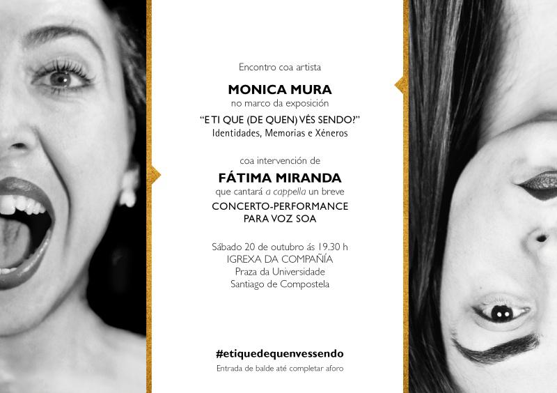 A Igrexa da Universidade, sede da exposición ‘E ti que (de quen) vés sendo? Identidades, memorias e xéneros’, será o marco no que o sábado 20 ás 19.30 horas se produza un encontro coa autora Monica Mura no que intervirá Fátima Miranda cun breve concerto-performance a capella para voz soa. A entrada ao evento é de balde ata completar aforo.