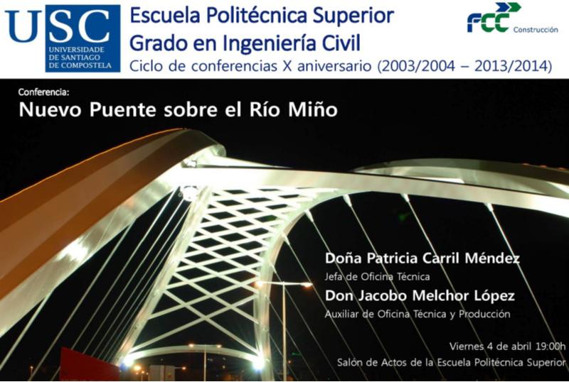 A Xefa da Oficina Técnica e o Axudante de Produción do equipo de FCC Construcción no momento da execución das obras, falarán na Escola Politécnica Superior do campus de Lugo sobre as distintas actuacións que incluía o proxecto da Nova Ponte sobre o Río Miño, e centrarán as súas intervencións especialmente no método de montaxe do tramo metálico sobre o río Miño. Ademais de facer unha pequena análise das distintas estruturas que conectan a ponte cos viais existentes e das mínimas afeccións ao tráfico da estrada Nacional VI, orientarán a súa exposición ao proceso de montaxe do tramo metálico con arco parabólico que une ambas marxes do río, así como das dificultades atopadas inicialmente para a execución do proxecto desta nova ponte. Esta nova infraestrutura viaria permite á cidade de Lugo contar cun acceso para o tráfico rodado deseñado para atender as necesidades reais e futuras sen condicionar o patrimonio histórico que constitúe a antiga ponte romana, hoxe en día restrinxida á circulación de vehículos. Os dous enxeñeiros, que coinciden en destacar a importancia da implicación de todos os membros do equipo para acadar os obxectivos marcados, subliñan a aceleración das obras e a satisfacción do cliente como dous dos resultados máis destacados. A obra foi inaugurada en xuño de 2011, acadando unha redución no prazo de execución de 9 meses sobre a data prevista e mantendo os parámetros de calidade e seguridade que caracterizan ás obras de FCC Construción.