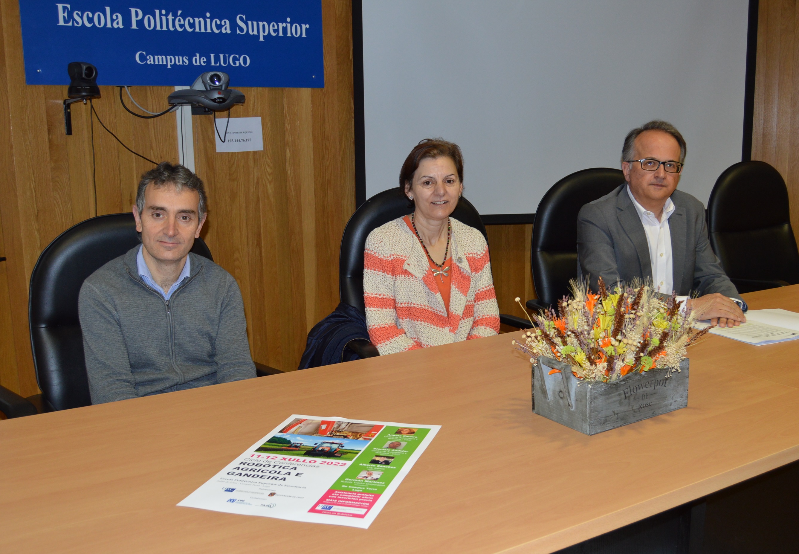 A directora da EPS de Enxeñaría, Rosa Romero; o coordinador do grao en Robótica da USC, Roberto Iglesias, e o profesor da mención da especialidade en Agrorobótica incluída neste título de grao, Javier Bueno Lema, presentaron este xoves este programa formativo e de divulgación sobre a realidade actual e as tendencias futuras da robótica agroforestal e gandeira, un foro aberto a toda a comunidade universitaria e demais cidadanía interesada na temática que reunirá no Campus Terra a catro representantes do mundo da empresa e da investigación.