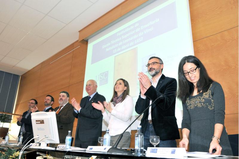 A Escola Técnica Superior de Enxeñaría conmemorou o seu patrón este xoves 10 co Día da Escola 2014 nun acto que presidiu o reitor Juan Casares. Acompañárono na mesa presidencial o director do centro, Antonio Mosquera González; a Logistic Manager de Abengoa Bioenergy-Bioetanol Galicia, Ana Belén López Silva; o subdirector da ETSE, Francisco Omil Prieto; os directores dos departamentos de Electrónica e Computación e de Enxeñaría Química, Francisco Fernández Rivera e Gumersindo Feijóo, respectivamente; e a secretaria do centro, Purificación Cariñena Amigo. A lectura da memoria de actividades da escola relativo ao curso 2012-2013 precedeu á entrega dos premios extraordinarios de Doutoramento e de Fin de Carreira, dos de Mellores traballos Fin de Grao e Fin de Máster e Proxectos Fin de Carreira. Tamén se entregaron os premios relativos aos mellores expedientes académicos e á Calidade Lingüística de traballos académicos. A continuación Ana Belén López Silva impartiu a conferencia ‘Biocarburantes: unha aposta enerxética sustentable’. O acto proseguiu coa entrega dos premios Leonardo á Docencia que recoñece aos/ás tres docentes das distintas titulacións que se imparten no centro que acadaron mellores resultados nas enquisas de satisfacción do alumnado. Tamén se recoñeceron aos/ás tres mellores docentes con maior produción científica ao longo de 2012 cos Leonardo á Investigación. Completando o acto, foi a quenda dos premios Tecnocom e Coremain ao mellor Traballo Fin de Grao en Enxeñaría Informática e o ViAQUA ao mellor Traballo Fin de Máster en Enxeñaría Ambiental.
