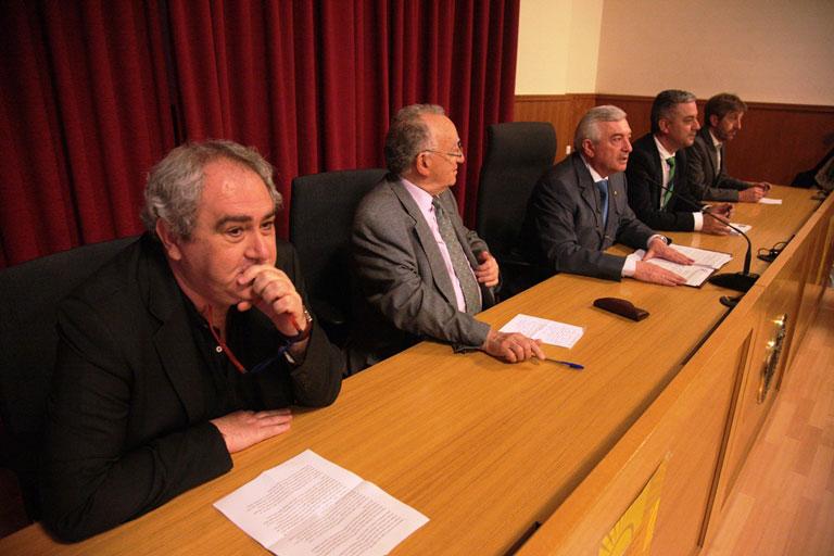 De esquerda a dereita, Ernesto González, Alonso Montero, Juan Viaño, Valentín García e Xosé Luís Regueira. Foto Servimav-USC